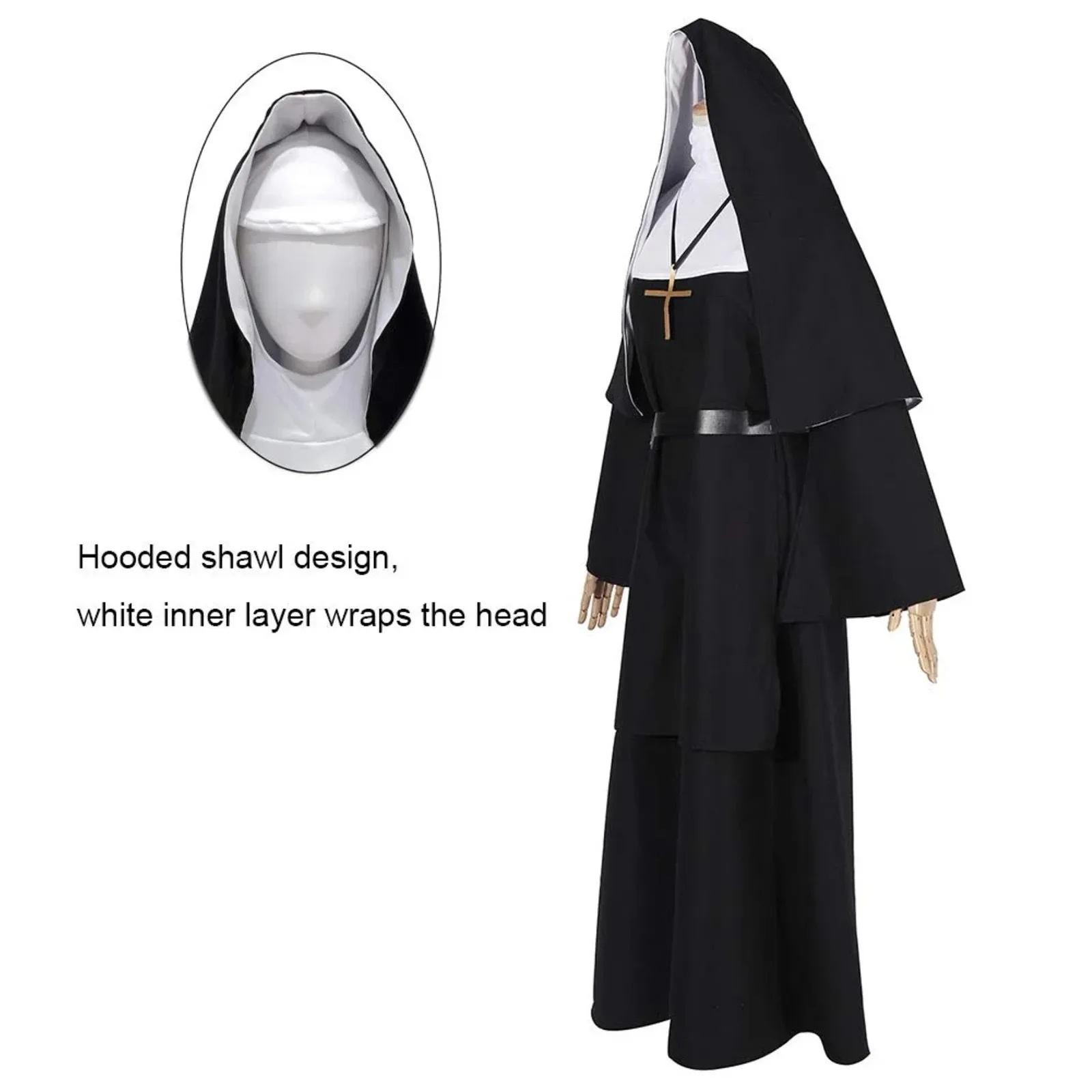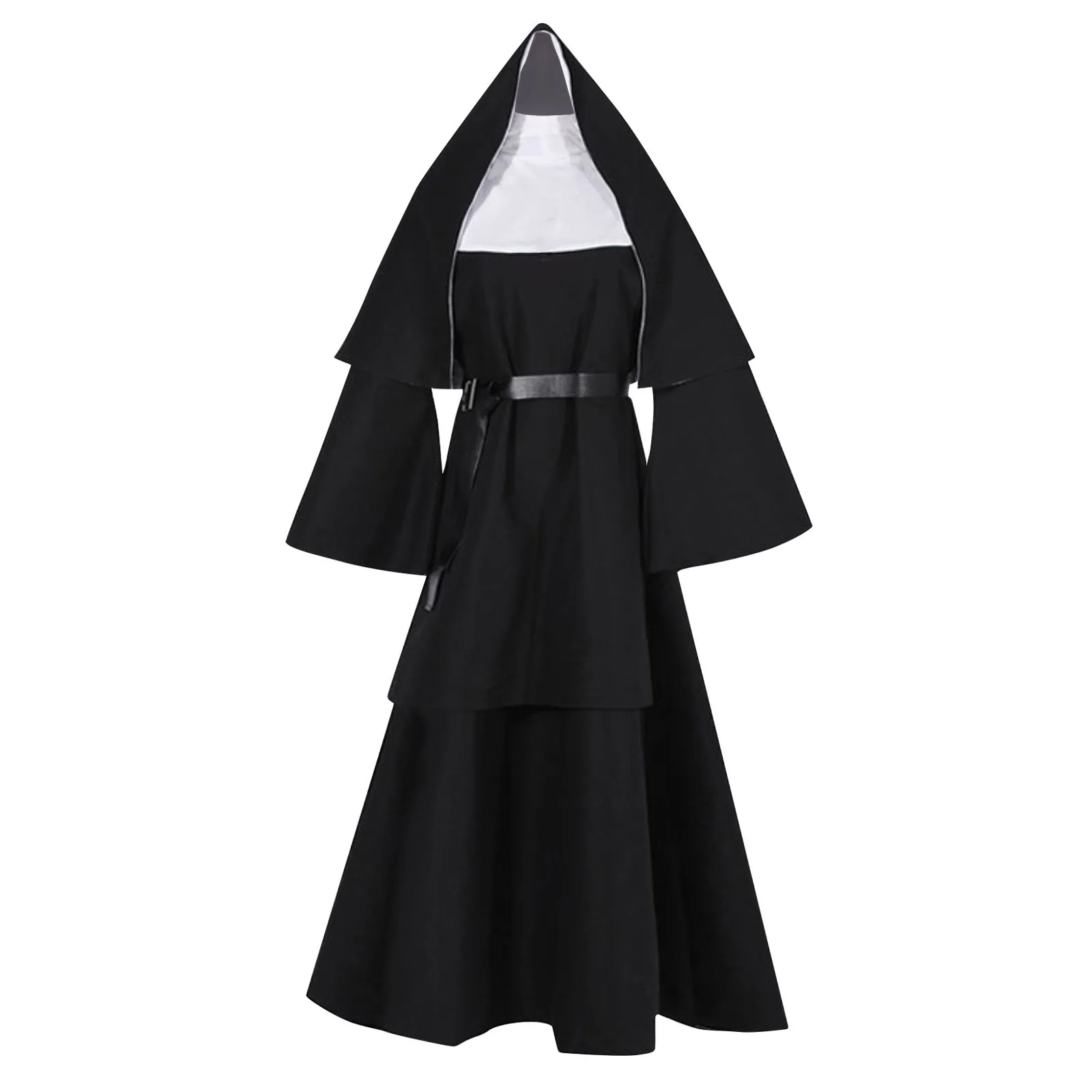 Halloween Nun Cosplay Costume – 4-Piece Set with Cape, Belt & Necklace
